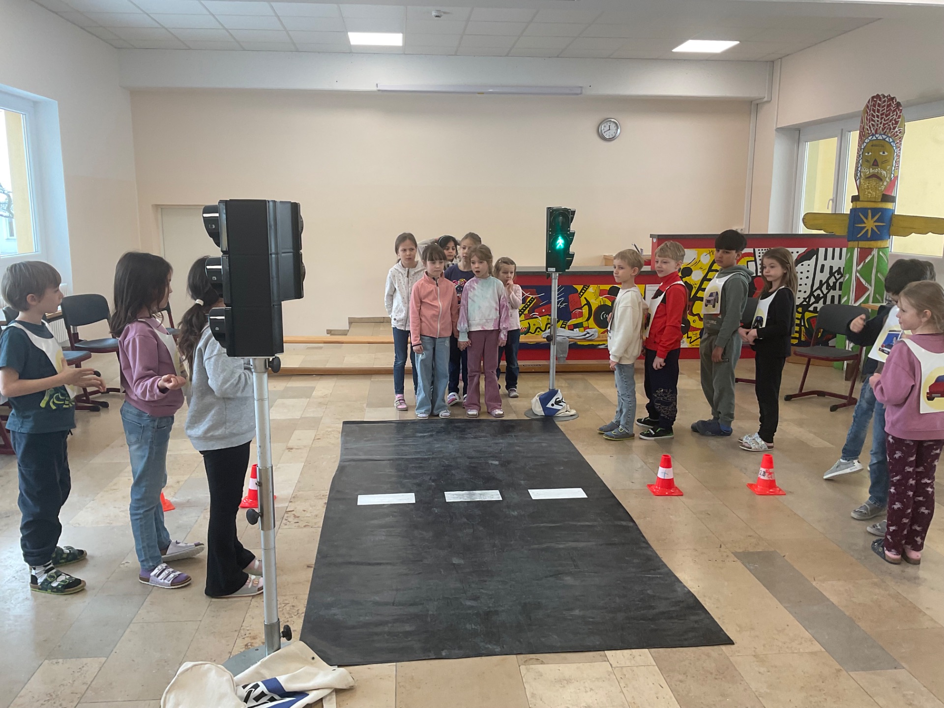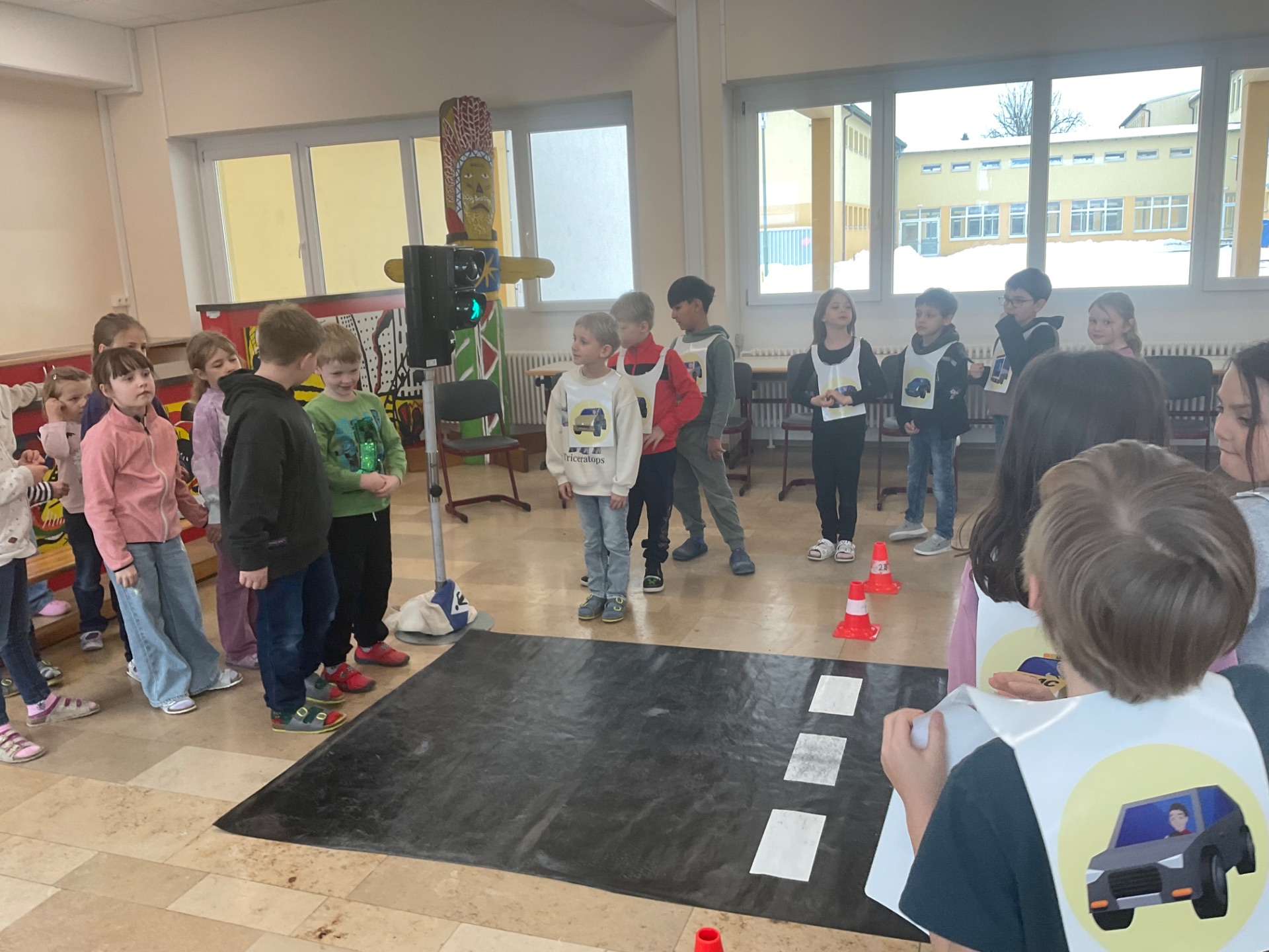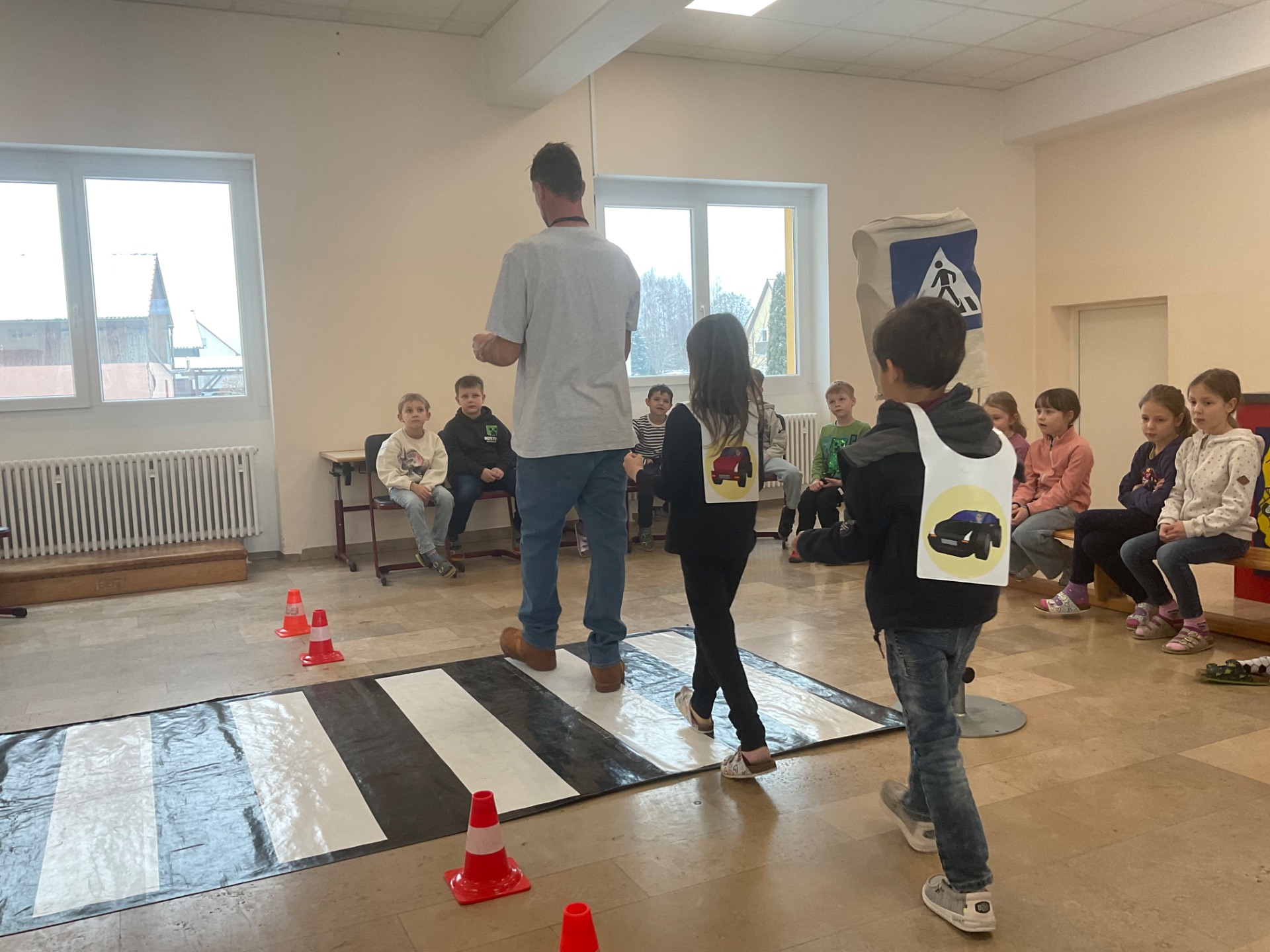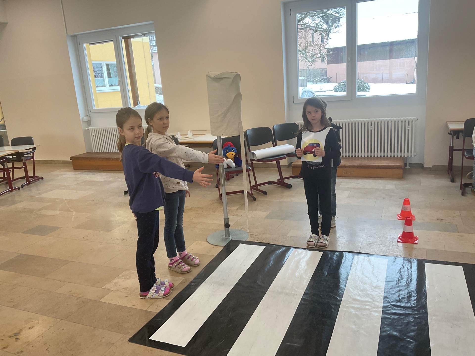 Die Schülerinnen und Schüler lernen die wichtigsten Regeln wie „stehen bleiben, schauen, hören, gehen“ und können ihr Wissen direkt sowohl an einem Zebrastreifen als auch an einer Ampel anwenden.