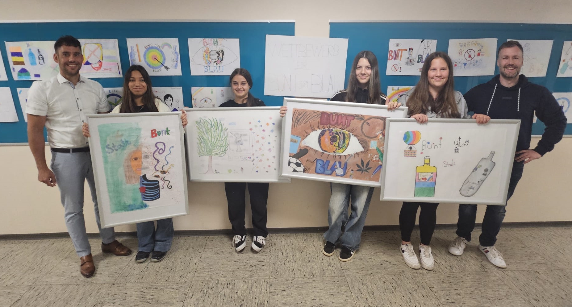 Fürs bundesweite Siegertreppchen hat es leider nicht gereicht: Die Arbeiten von vier Schülerinnen der 8. Klasse wurden beim Wettbewerb "bunt statt blau" der DAK dennoch ausgezeichnet. Für ihr Engagement gegen exzessiven Alkoholkonsum erhielten Faith Tungol, Joanna Zintl, Anastasiia Shapovalova und Katja Stengl ihr Werk in einem professionellen Rahmen und kleine Geschenke.