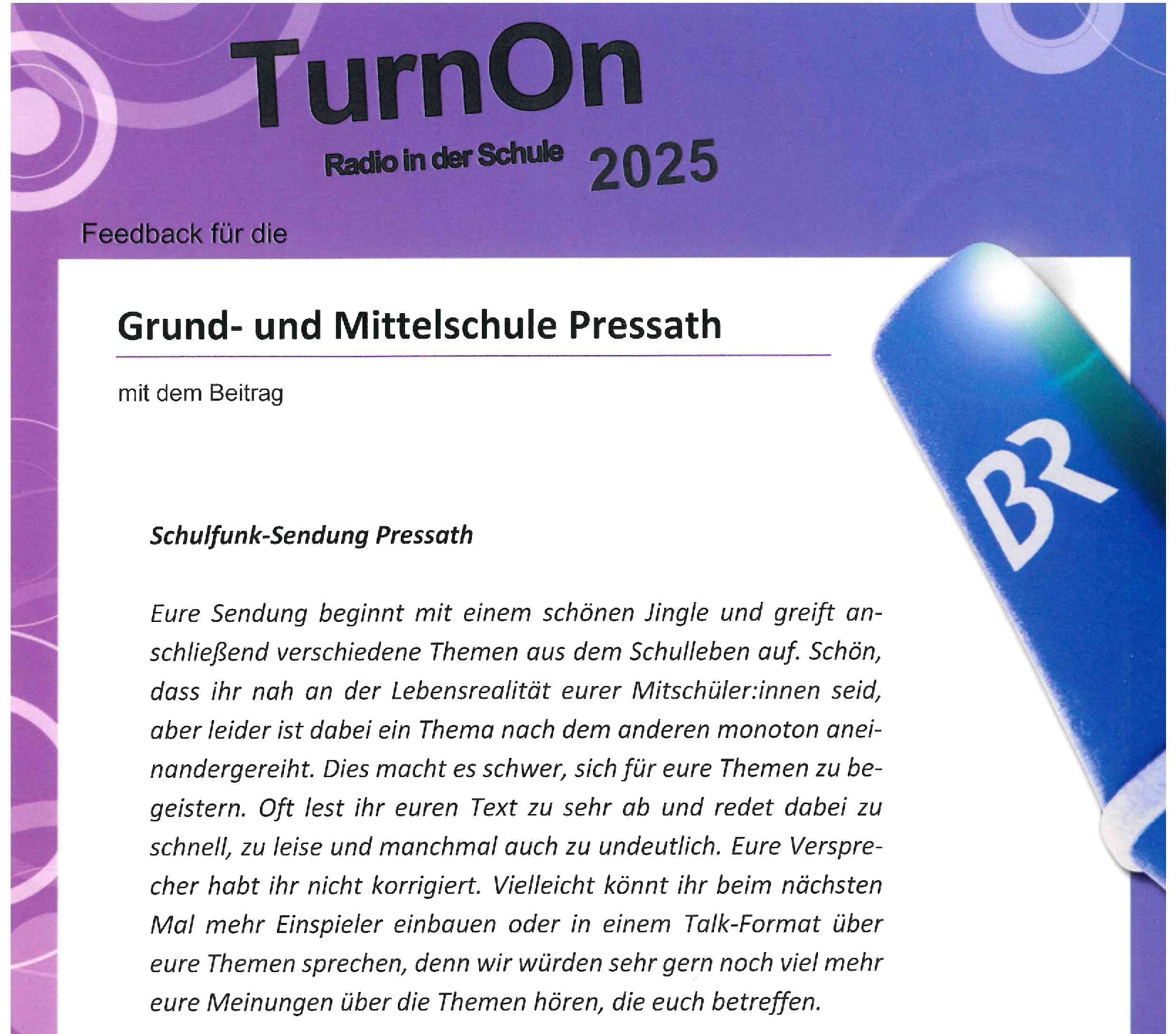 Das kommende Schuljahr wird für uns mit einem Höhepunkt beginnen. Schon Anfang Oktober hat uns der Bayerische Rundfunk für zwei Tage ins Funkhaus in München eingeladen, wo wir an einem Schulradio-Workshop unter dem Titel "TurnOn" teilnehmen werden. Die Grund- und Mittelschule darf sich nun "Projektpartner des Bayerischen Rundfunks 2022" nennen.