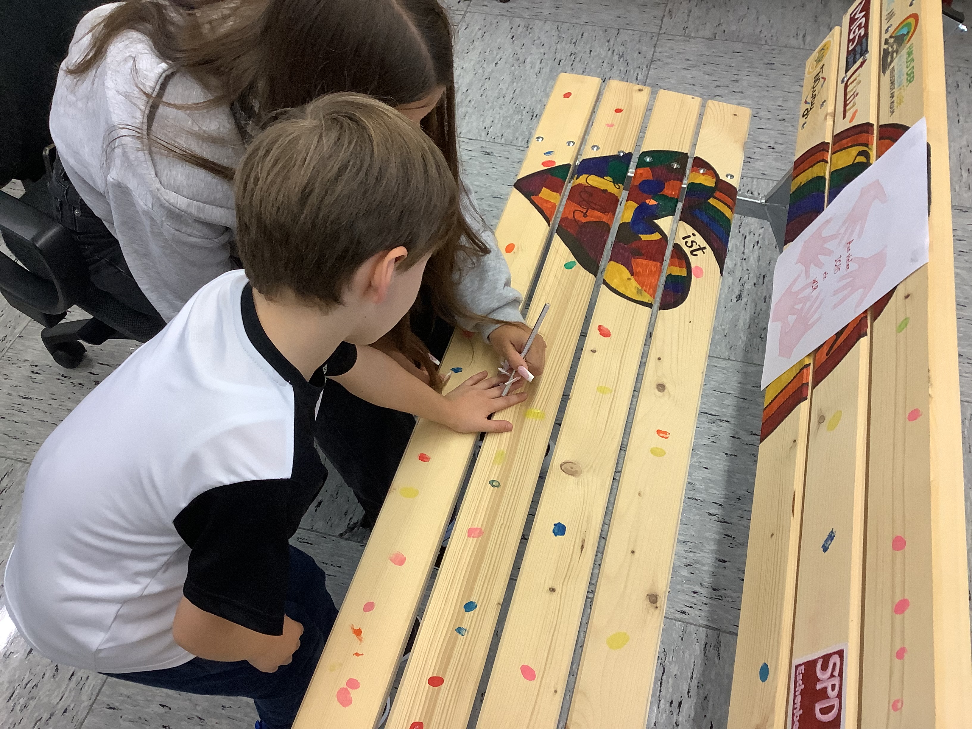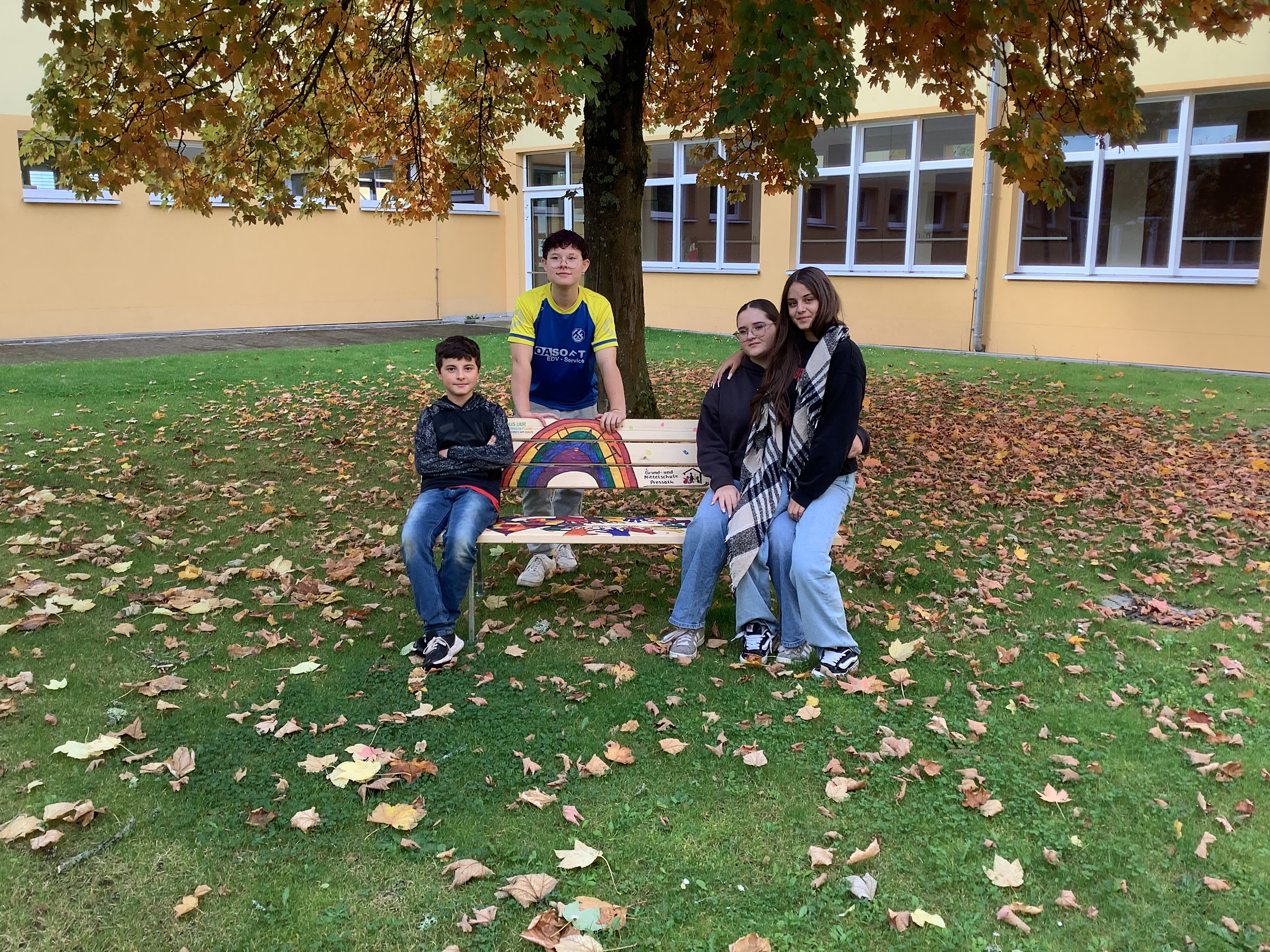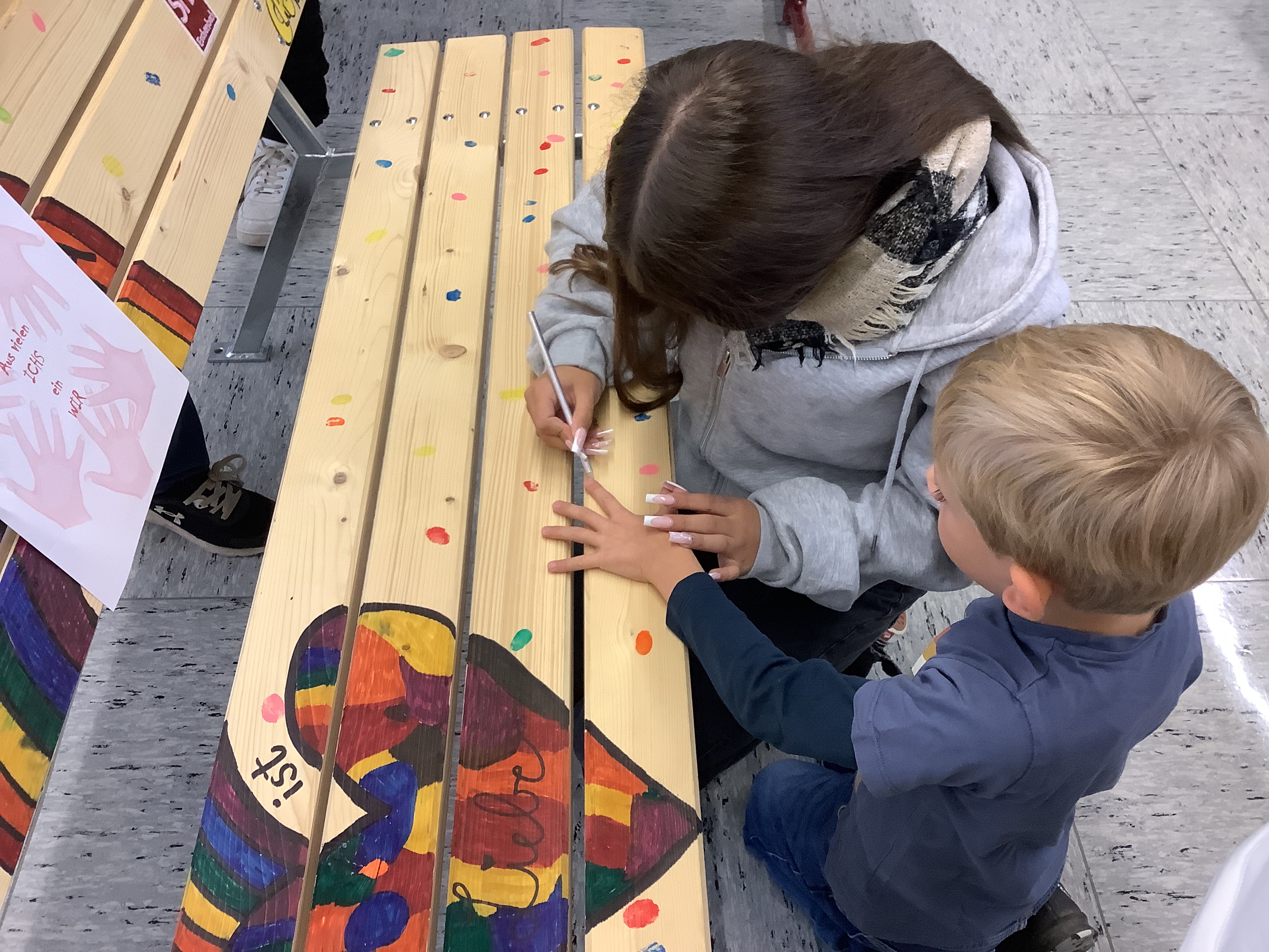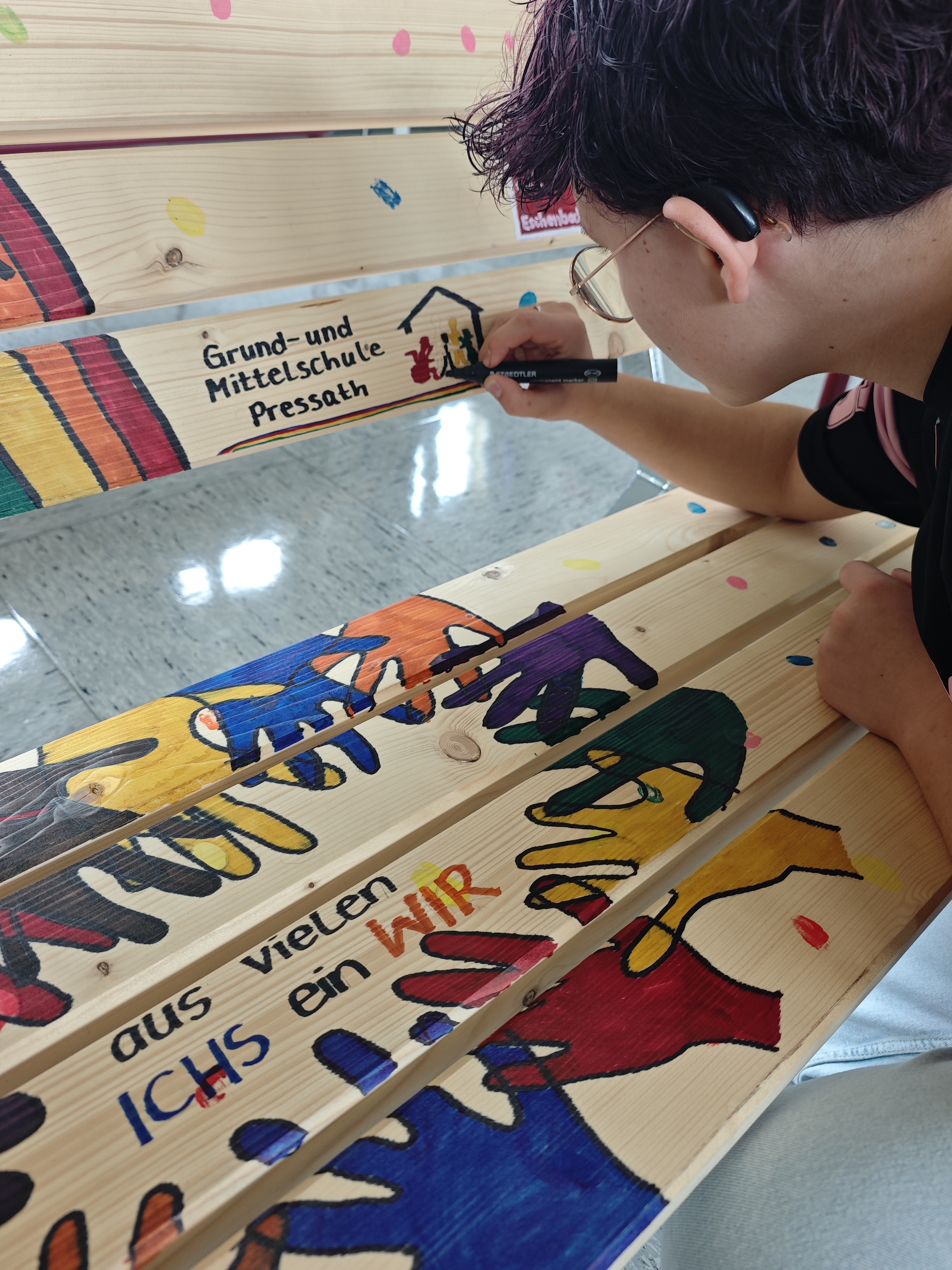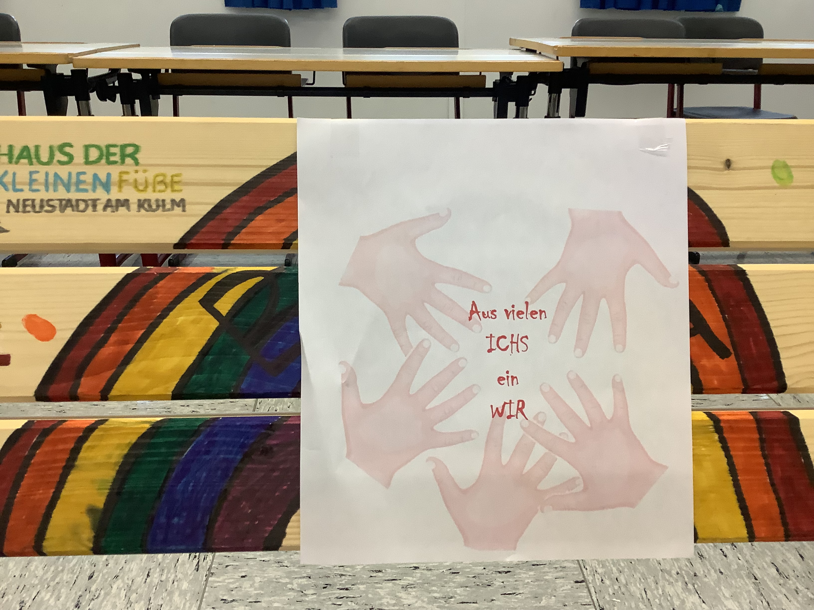Häufige gegenseitige Beleidigungen und Mobbing brannten den Befragten am meisten unter den Nägeln. Zur Stärkung des Zusammengehörigkeitsgefühls wurde daher ein gemeinsames Motto für ein riesiges Bauzaun-Banner gesucht. Aus dem schulinternen Wettbewerb ging Fatima Ahmadova als Siegerin hervor: „Aus vielen Ichs ein Wir“, hatte sie vorgeschlagen. Dieser Slogan begrüßt die Schüler nun im Eingangsbereich, nachdem alle von der ersten bis zur neunten Klasse diesen mit einem bunten Handabdruck „unterschrieben“ hatten.