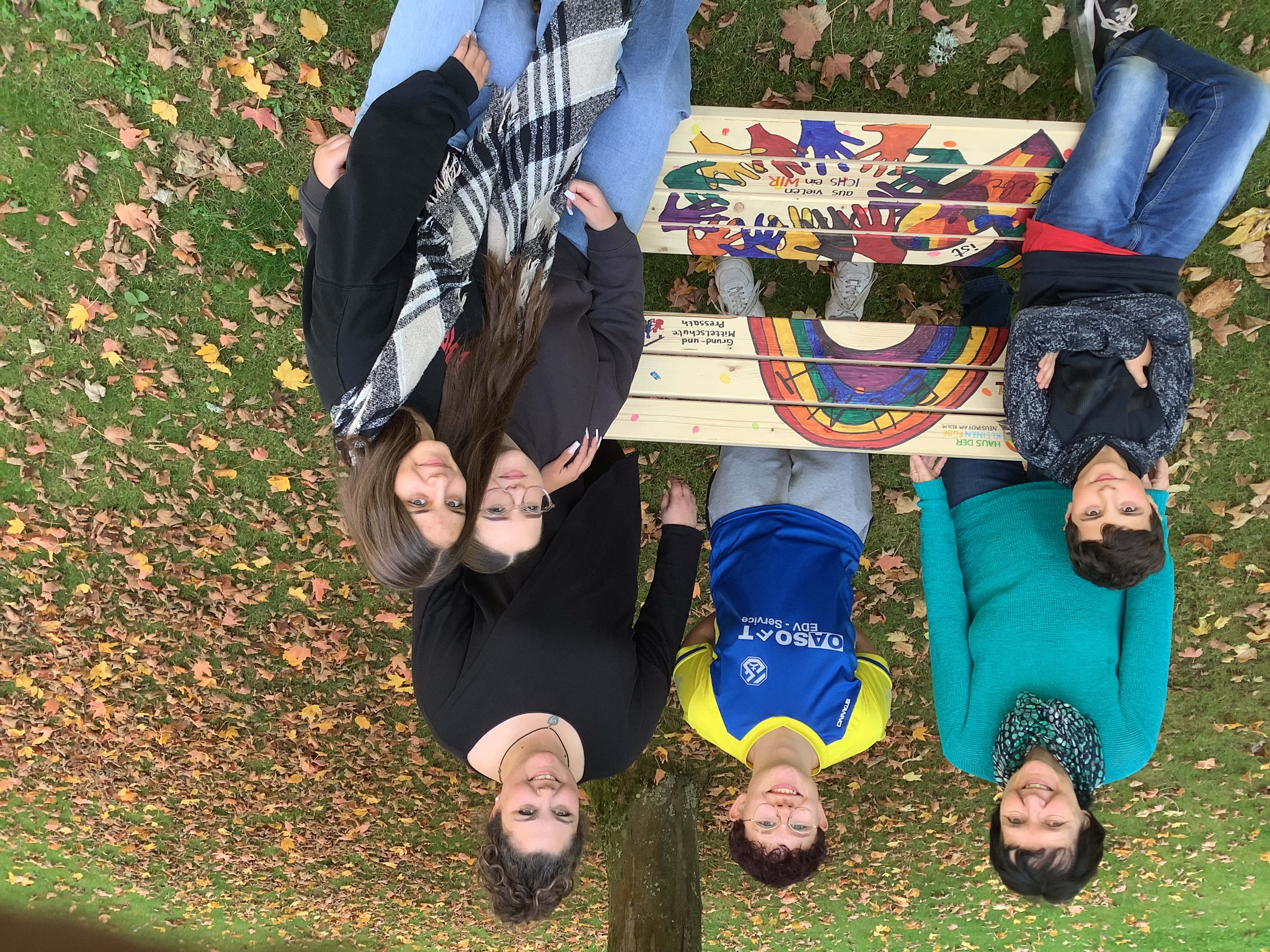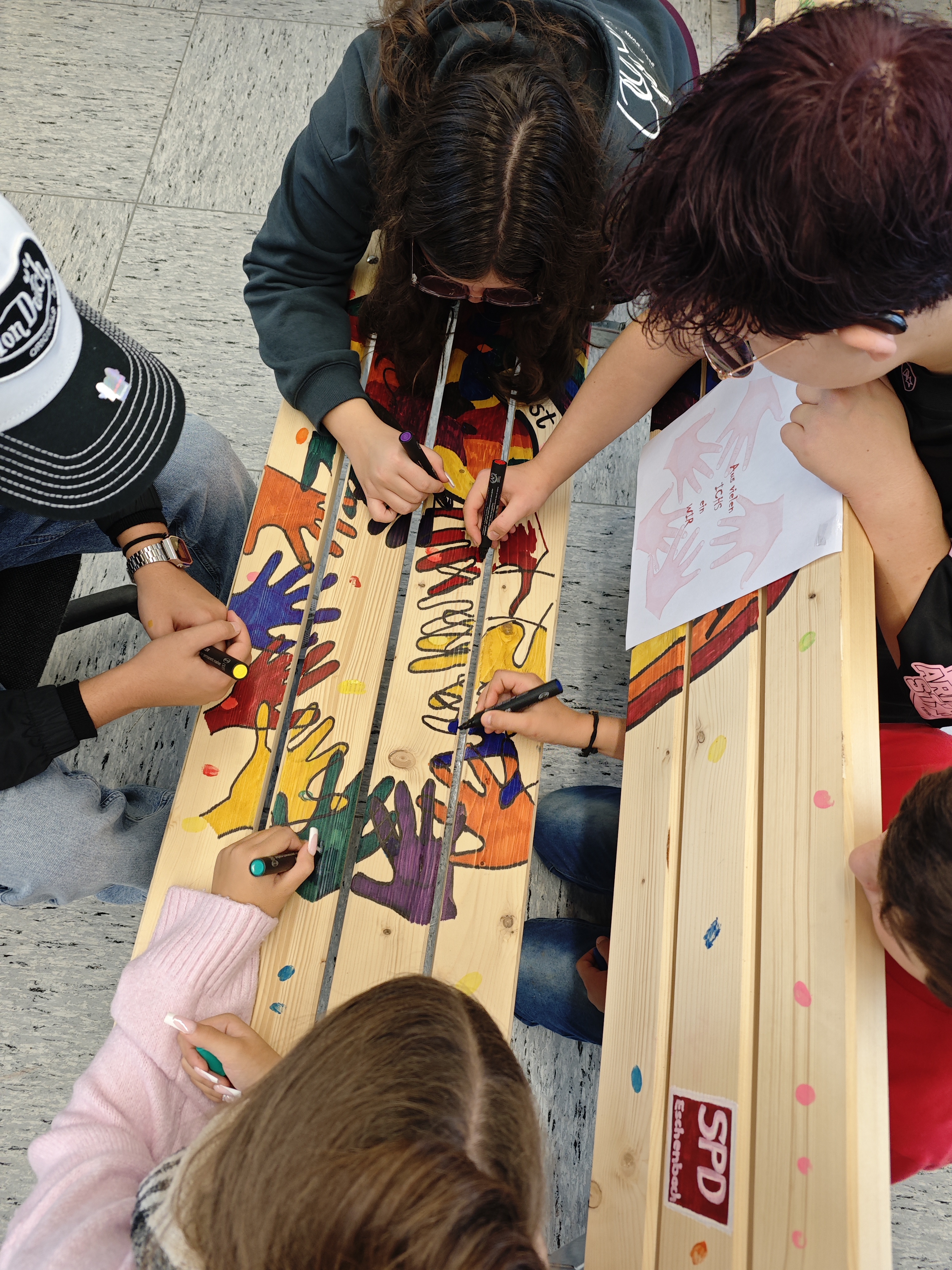 Unsere Schülersprecher Kaan Patar, Toni Hänisch und Theresa Dziwok sowie Joanna Zintl und Emilia Krüger entschieden sich für einen bunten Kreis aus Händen, in dessen Mitte das Motto der Schule „Aus vielen ICHS ein WIR“ platziert wurde. Um diesem auch gerecht zu werden, stellte eine Schülerin oder ein Schüler aus jeder Klasse seinen Handumriss als Modell zur Verfügung.